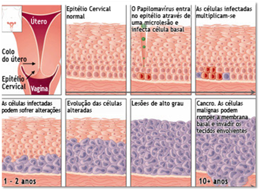 A infecção persistente por tipos de alto risco do HPV é o principal fator etiológico para o desenvolvimento de alterações celulares no colo do útero. O HPV integra seu material genético no DNA das células epiteliais cervicais, interrompendo os mecanismos celulares de controle de crescimento e divisão. Este processo leva ao desenvolvimento de displasia cervical, também conhecida como neoplasia intraepitelial cervical (NIC). A NIC é classificada em graus (NIC 1, NIC 2 e NIC 3), representando a severidade da alteração celular e o risco de progressão para carcinoma invasivo. A identificação e o manejo adequado da displasia cervical são, portanto, essenciais para prevenir o câncer.