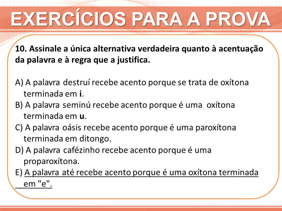 A acentuação gráfica em português é regida por um sistema complexo de regras, que considera a tonicidade das sílabas, a terminação das palavras e a sua classificação morfológica (oxítonas, paroxítonas, proparoxítonas). A Nova Ortografia, implementada a partir de 2009, trouxe algumas alterações significativas, como a extinção do acento diferencial em palavras homógrafas como "pára" (verbo parar) e a reformulação das regras de acentuação dos ditongos abertos "éi", "ói" e "éu" em palavras paroxítonas. O conhecimento destas regras, bem como das suas exceções, é essencial para a identificação de inadequações na acentuação. Por exemplo, a regra geral dita que proparoxítonas são sempre acentuadas (ex: lâmpada, médico), enquanto paroxítonas terminadas em "a, e, o, em, ens" não o são (ex: casa, leve, livro, homem, jovens). As oxítonas, por sua vez, serão acentuadas quando terminadas em "a, e, o, em, ens" (ex: sofá, café, cipó, armazém, parabéns).
