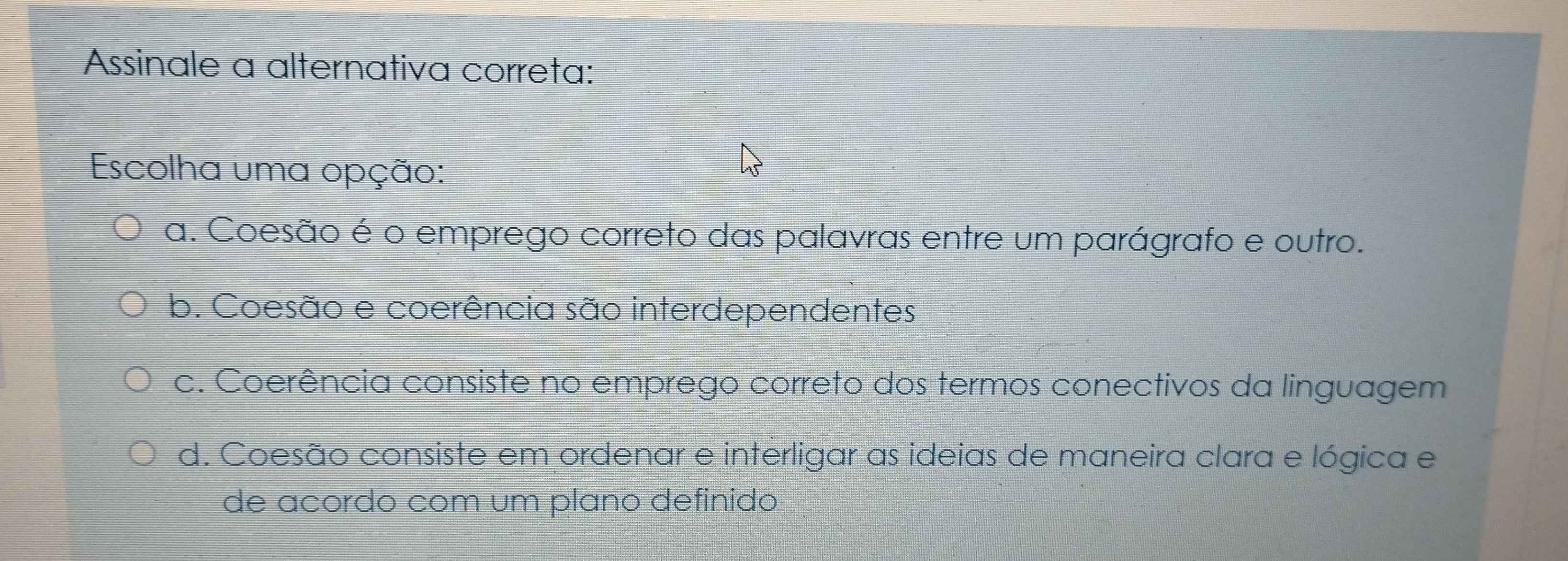 A coesão se refere aos mecanismos linguísticos que conectam as partes de um texto, como conectivos, pronomes e repetição lexical. A coerência, por sua vez, diz respeito à organização lógica e semântica do texto, garantindo que as ideias sejam relevantes, consistentes e interligadas, formando um todo significativo. Embora distintas, coesão e coerência são interdependentes: a coesão contribui para a coerência, e a coerência orienta a escolha dos mecanismos de coesão.