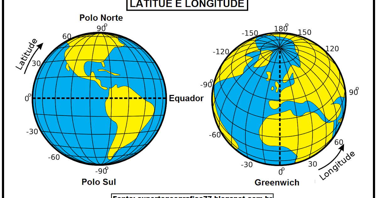 Latitude é a distância angular, medida em graus, de um ponto na Terra em relação ao equador (0°). Varia de 0° no equador até 90° nos polos Norte e Sul. Longitude é a distância angular, medida em graus, de um ponto na Terra em relação ao meridiano de Greenwich (0°). Varia de 0° em Greenwich até 180° para leste e oeste.